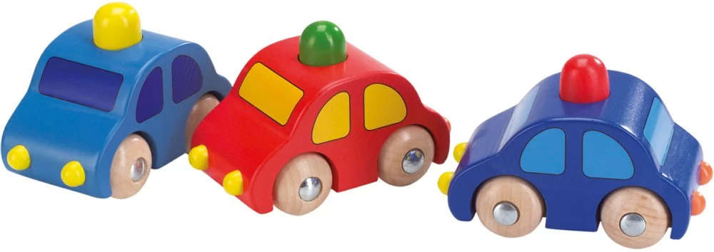 3 modellen houten autootjes met toeter . Wanneer je op het mannetje duwt klinkt de toeter. Goed hanteerbaar voor de allerkleinsten.