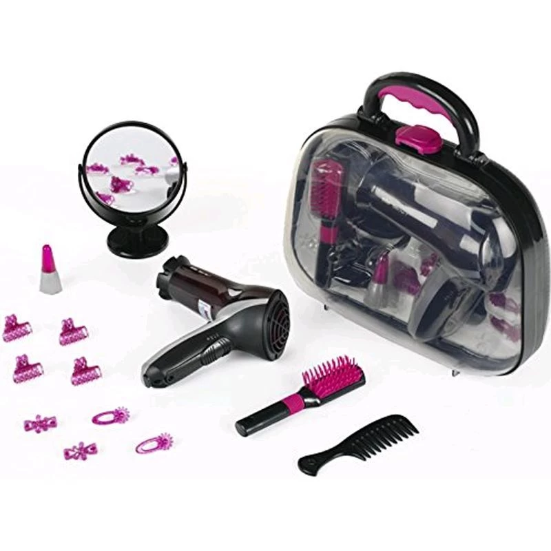 De kapperskoffer voor kinderen bevat de Braun Stain Hair 7 fohn op batterijen, een handspeigel, borstel, kam en haarspeldjes.