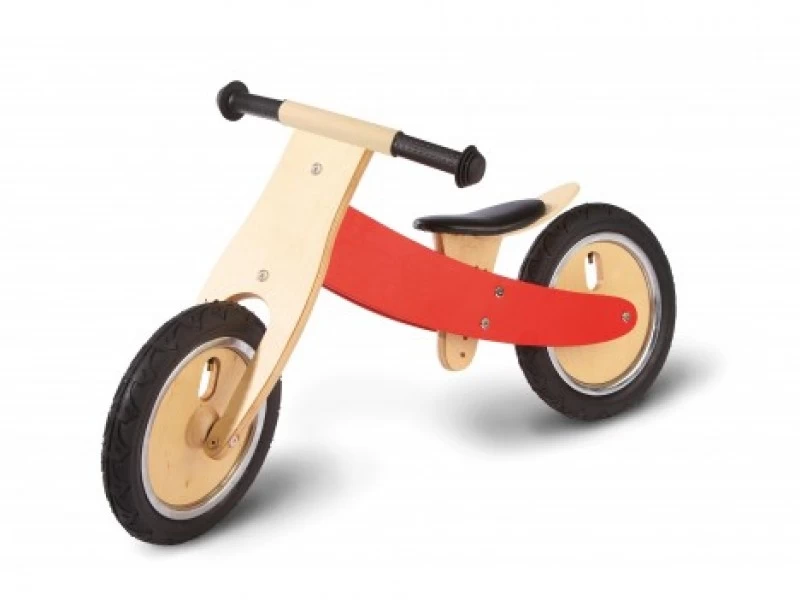 Mooie houten loopfiets in de kleur rood. Er zijn 2 stickersets (vlinders en vlammen) waarmee deze versierd kan worden.