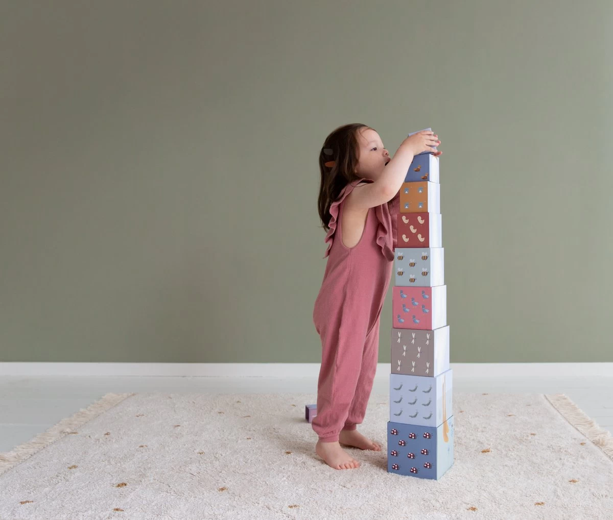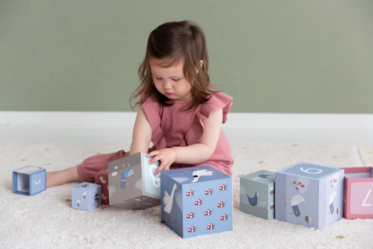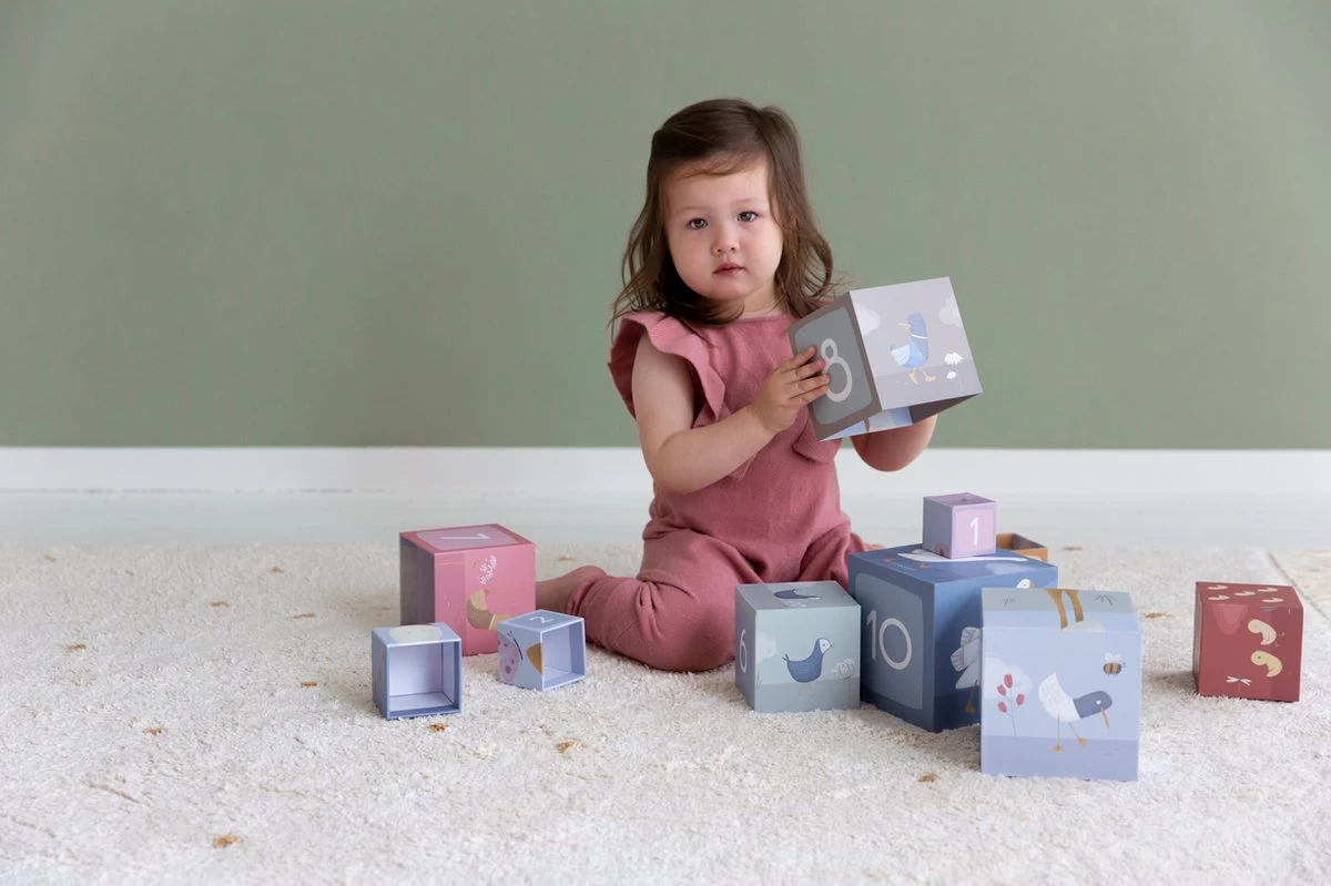Kinderen leren spelenderwijs tot 10 te tellen met deze blokkentoren. De blokken zijn geïllustreerd met onze herkenbare Gans en al zijn vriendjes die rond de vijver op het platteland wonen.Je kunt de blokken op elkaar zetten en een hoge toren maken of horizontaal op de grond leggen om de verschillende groottes te ontdekken. Vanaf 18 maanden.